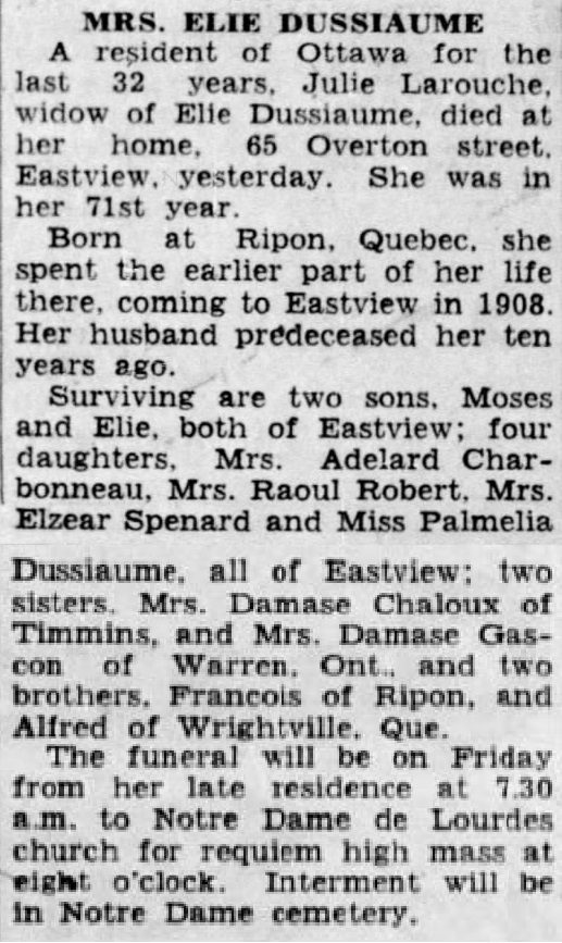 4 "Obituary of Mrs. Elie Dussiaume," (Ottawa) Ottawa Citizen, 12 Sep 1940, p. 19.