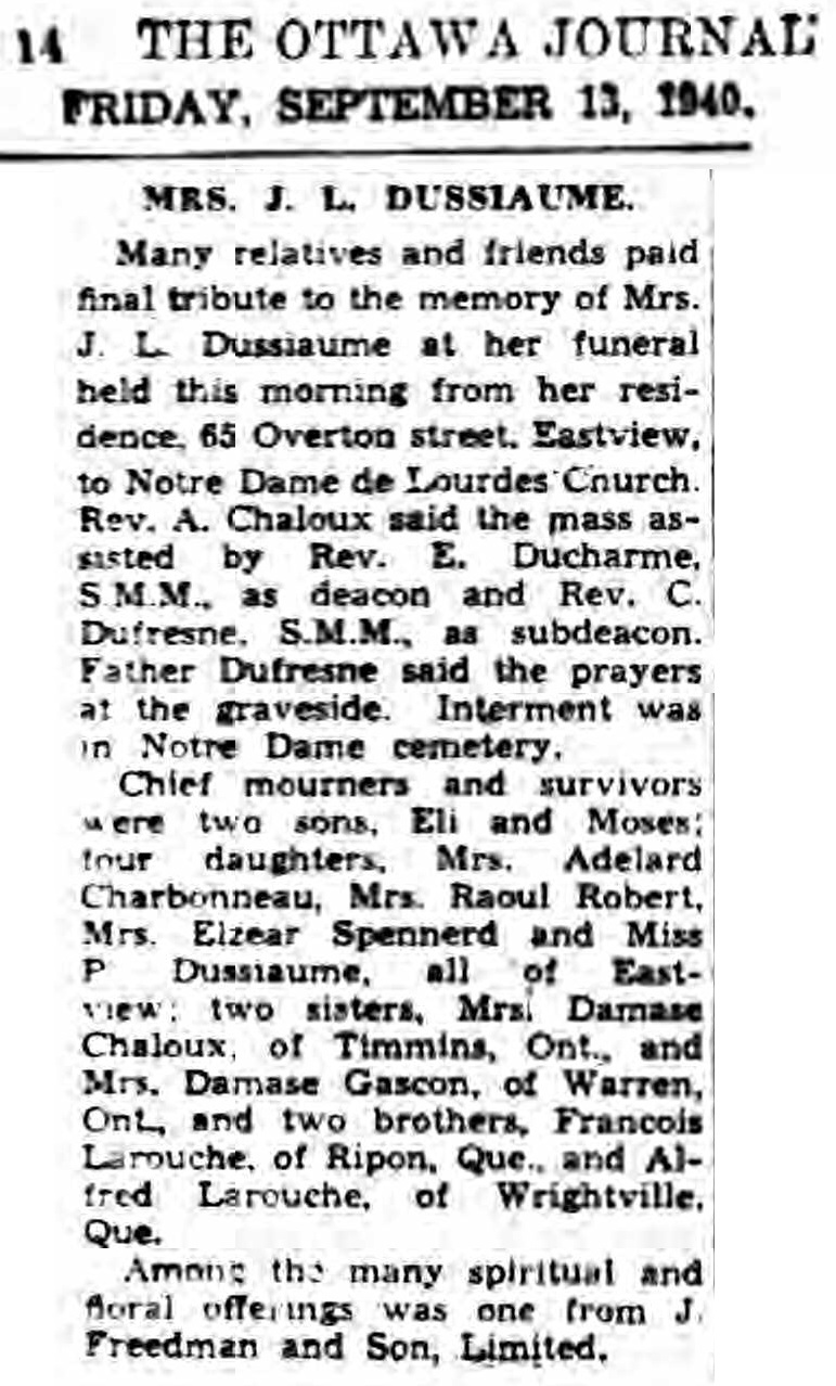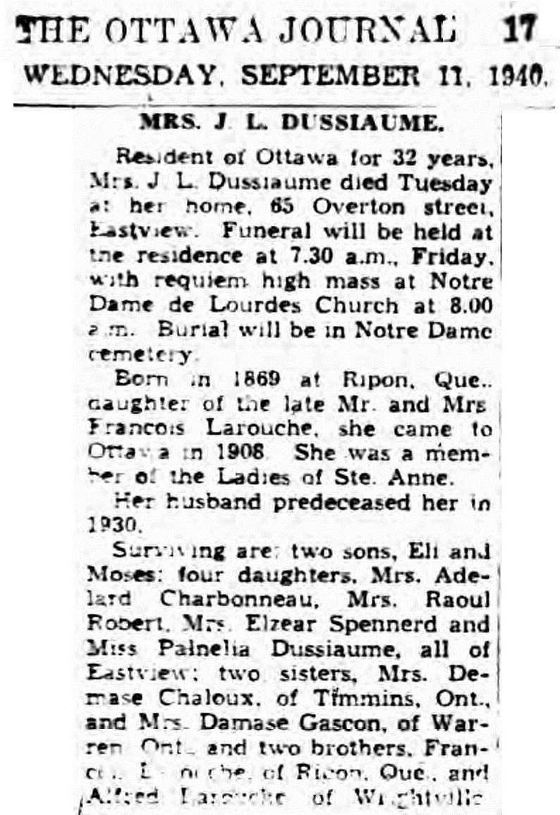 15 "Obituary for Mrs. J. L. Dussiaume," (Ottawa) The Ottawa Journal, 13 Sep 1940, p. 14.