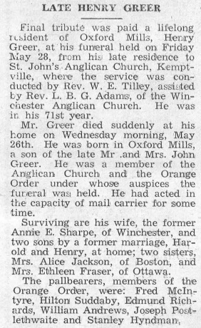 • He was buried at the Oxford Mills Anglican Cemetery in Oxford Mills, Grenville, Ontario, Canada on 28 May 1948. 3 5 6 • His obituary was published in the Kingston Whig Standard on 8 Jun 1948 in Kingston, Frontenac, Ontario, Canada. It read as follows:
