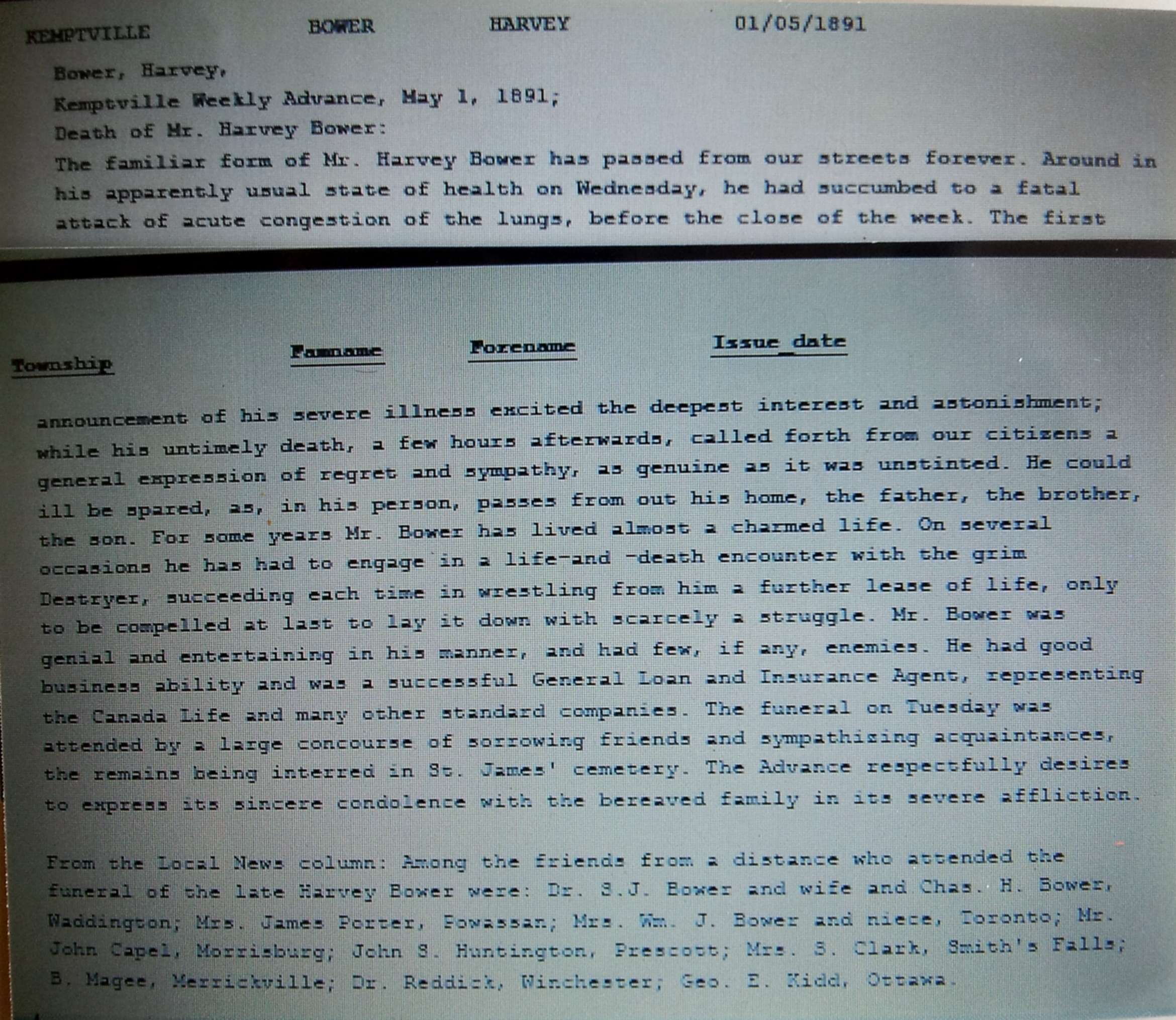 4 "Death of Harvey Bower," Kemptville Advance - Birth, Marriage and Death Index, 1 May 1891, p. 1; digital images.