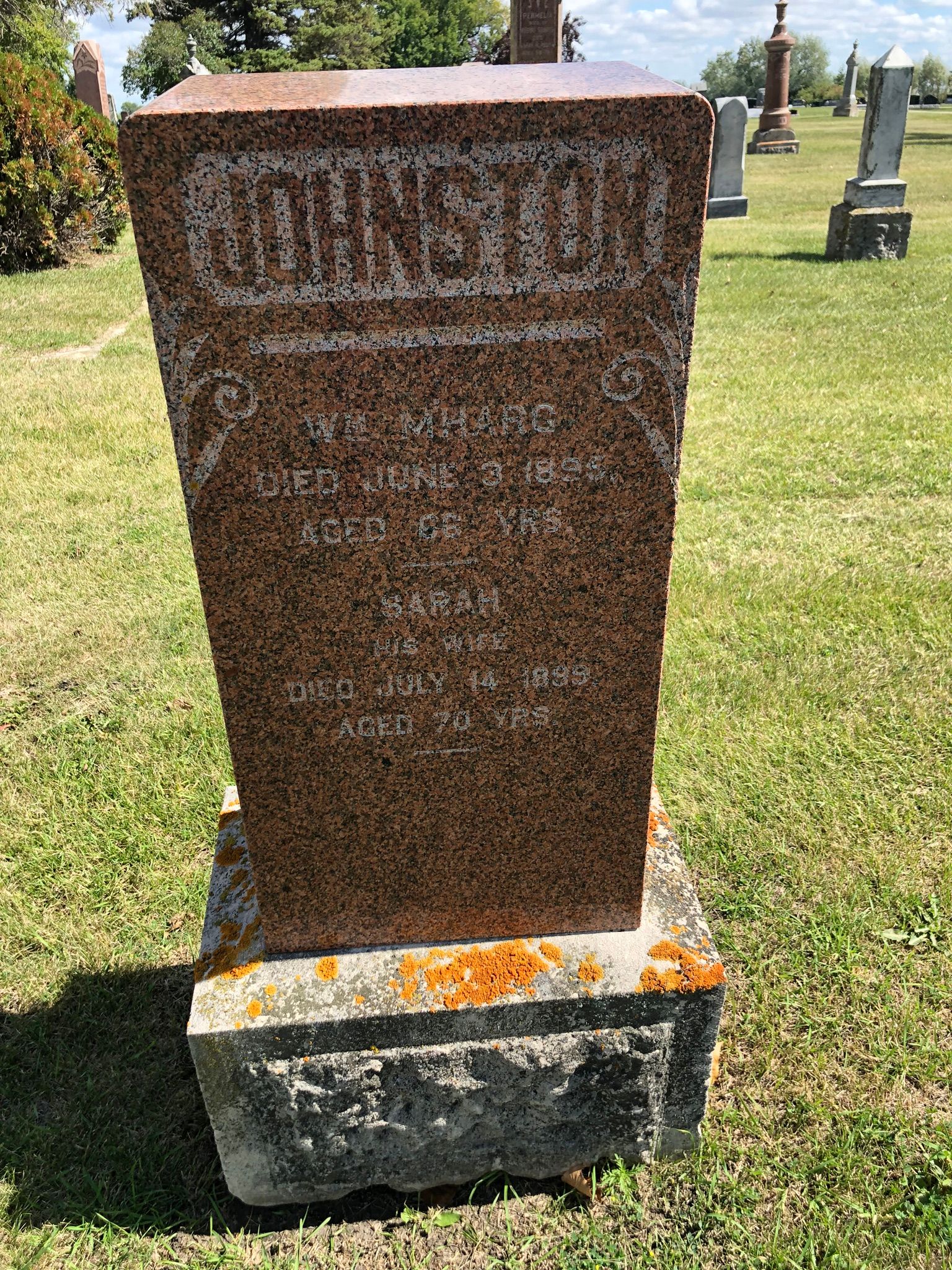 • She was buried at the Greenwood Cemetery, Grave W, Plot 4, Row 8 in Carman, Pembina Valley, Manitoba, Canada in Jul 1899. 7 • She has conflicting death information of 3 Dec 1899. 1 Under link to husband William McHarg. Sarah married William McHARG, son of John McHARG and Agnes GIBNEY, on 19 Oct 1852 in Kingston, Frontenac, Ontario, Canada.1 (William McHARG was born on 20 Jan 1829 in Ayr, , Ayr, Scotland 8, baptized on 29 Jan 1829 in Ayr, , Ayr, Scotland,1 died on 3 Jun 1895 in Camden East, Lennox and Addington, Ontario, Canada 1 8 9 10 and was buried in Jun 1895 in Lime Lake, Hastings, Ontario, Canada 10 11 12.). The cause of his death was cancer. Facts and details related to their marriage were: • Alternate Marriage: 1853, Tara, Offaly, Leinster, Ireland. 1 Marriage Notes: Under the name William McHarg |