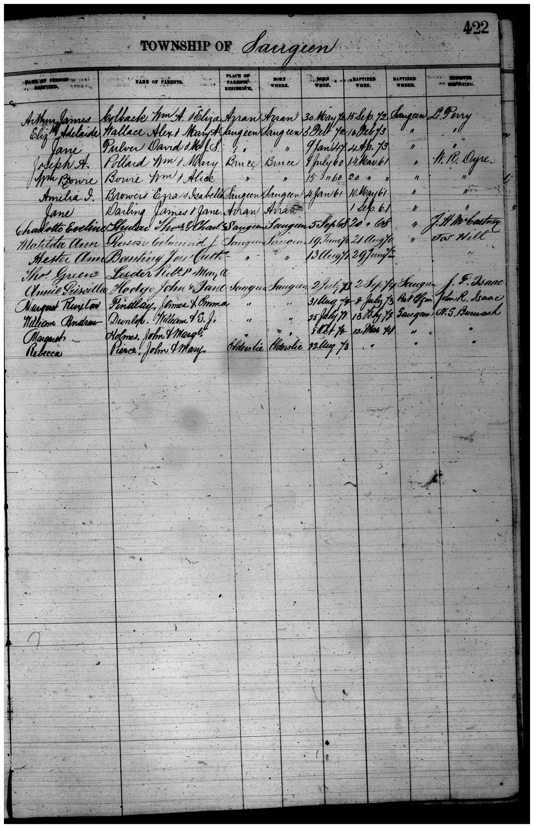| Sitge | Ada Jane | 3/333.jpg | Edm'd | Mary Jane | S. East Hope | S. East Hope | 1866-02-02 | 1866-09-09 | Gore of Downie | Brown, Rev. G. M. | Perth, ON | Downie Twp. | 3 | 333 |