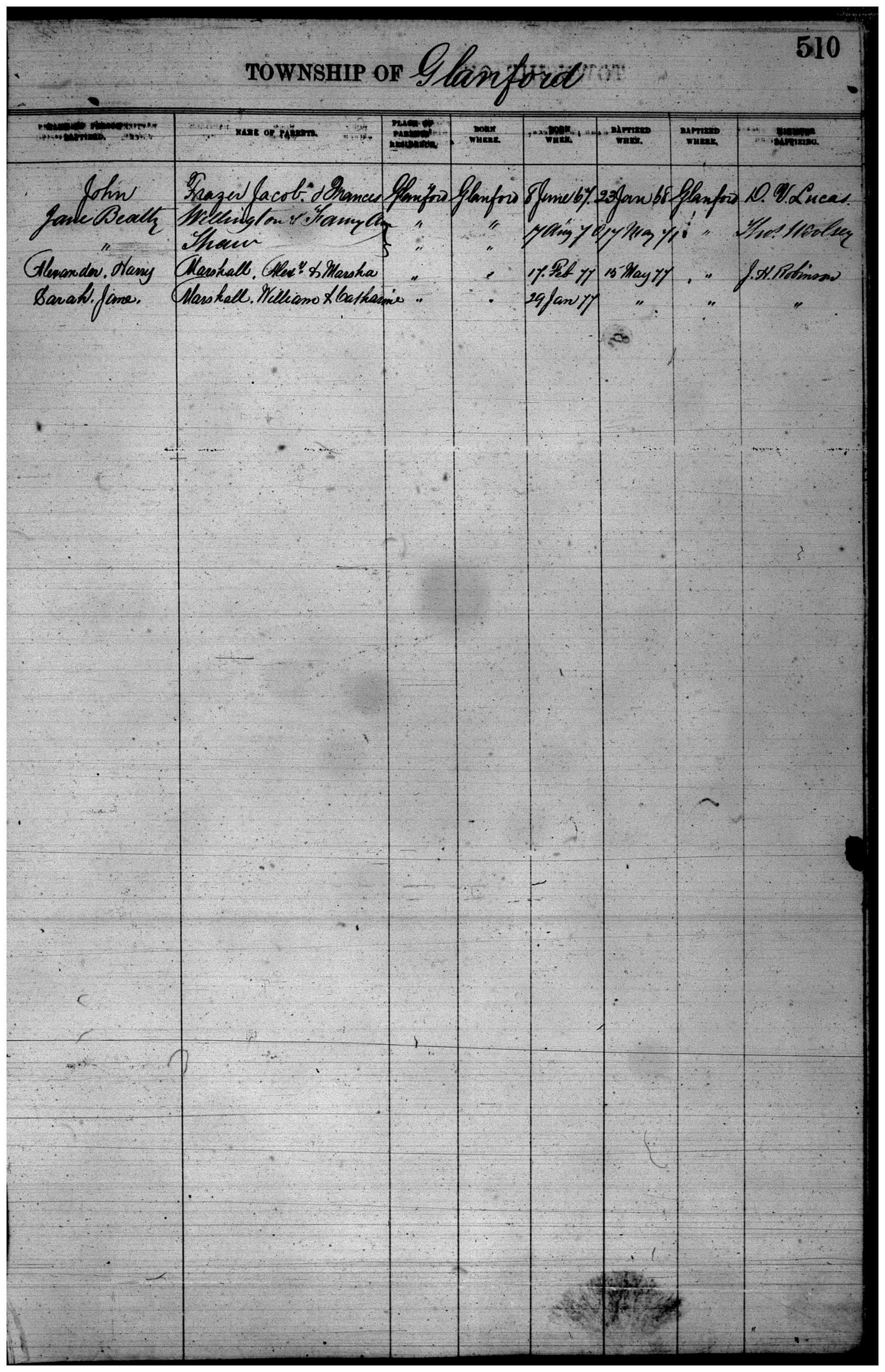 | Shaver | George B. | 4/346.jpg | J. W. | Mary | Hamilton | Hamilton | Hamilton | Kay, Rev. John | Wentworth, ON | Hamilton, Hannah St. | 4 | 346 | ||