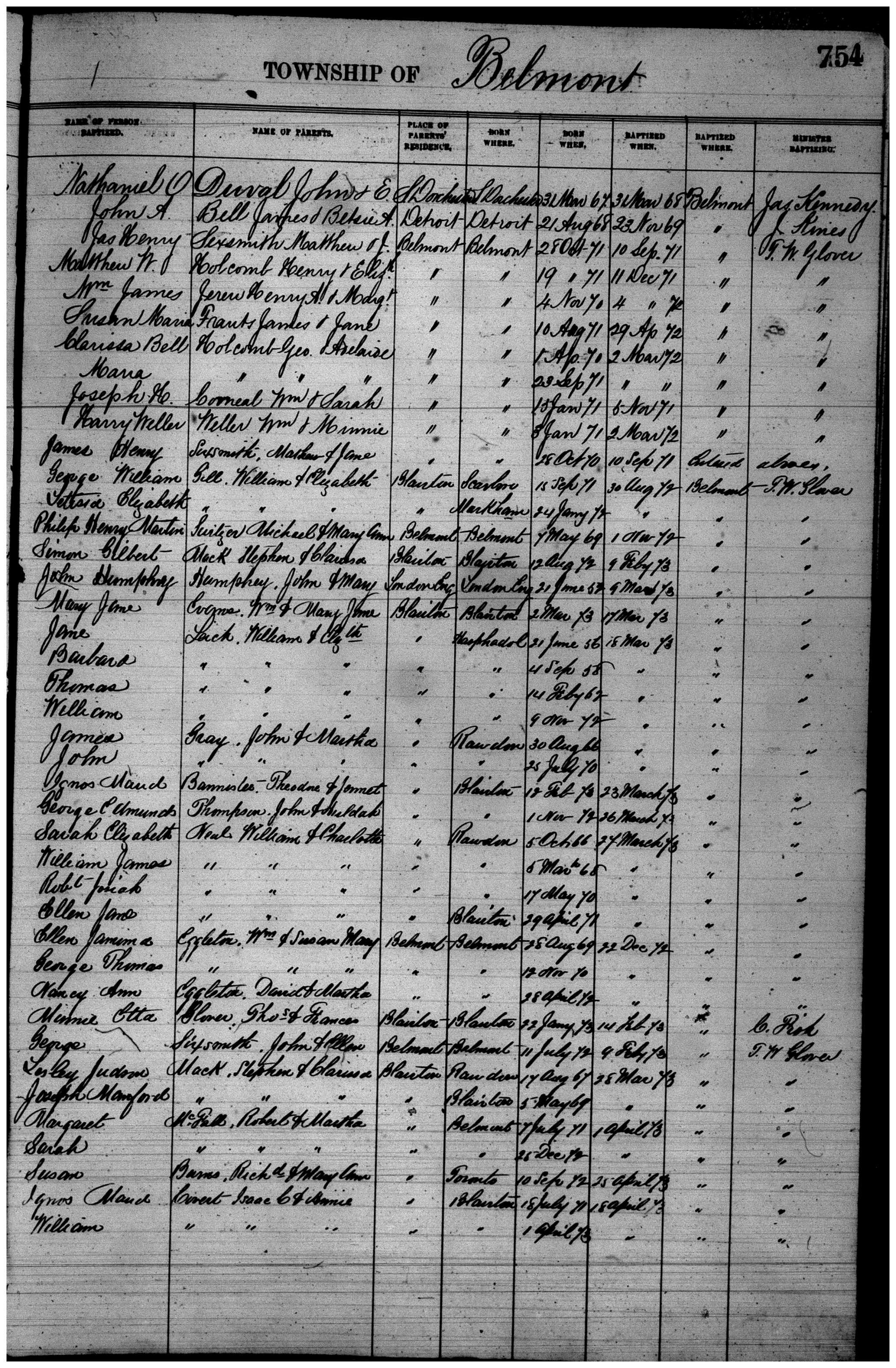 | Sixsmith | George | 3/754.jpg | John | Ellen | Belmont | Belmont | 1872-07-11 | 1873-02-09 | Belmont | Glover, Rev.T. W. | Peterborough, ON | Belmont Twp. | 3 | 754 |