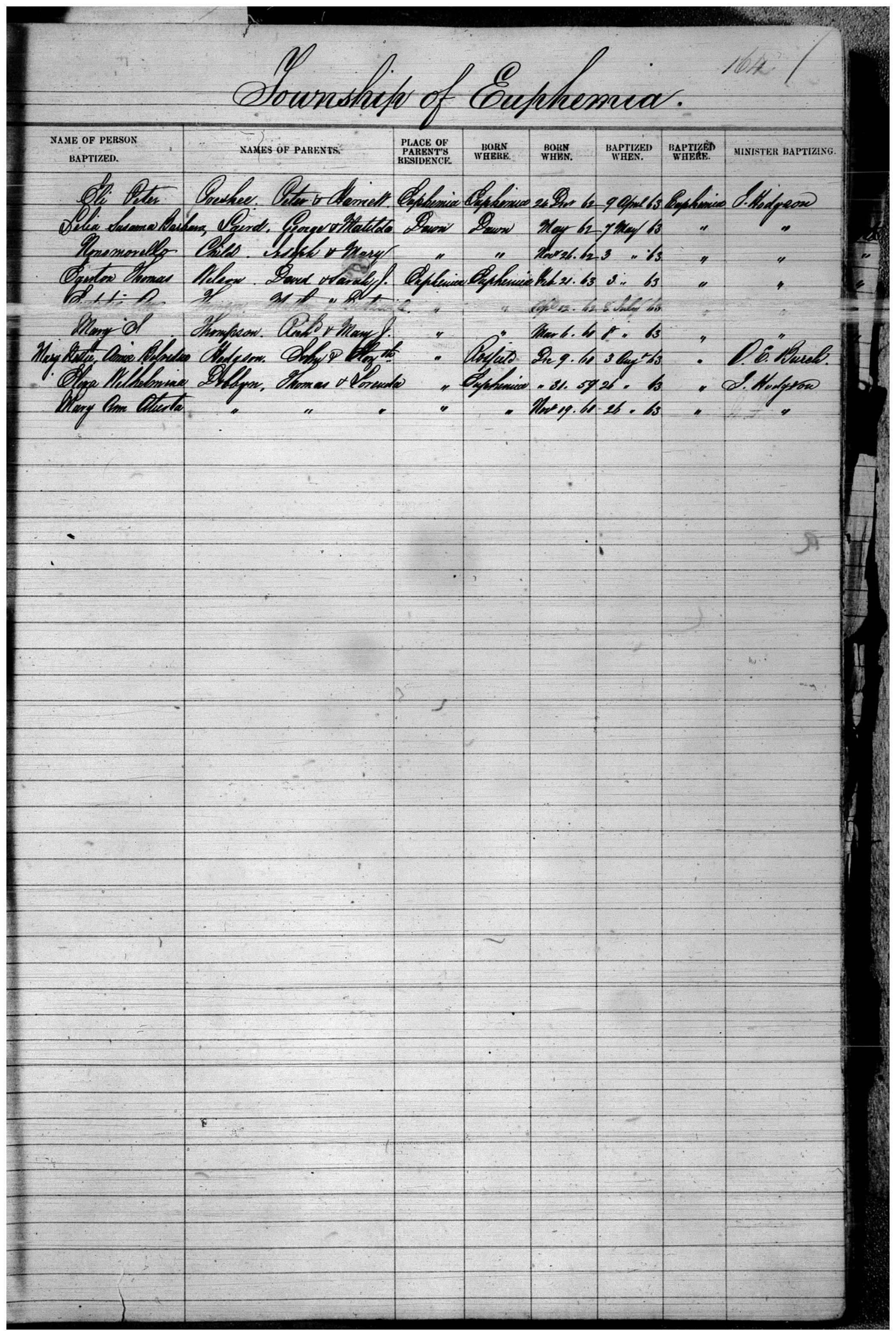 | Thomson | Eustatia Ann | 2/164.jpg | Mathew | Eustasia A. | Euphemia | Euphemia | 1862-04-12 | 1863-07-08 | Euphemia | Hodgson, Rev. J. | Lambton and Kent, ON | Euphemia (now Dawn-Euphemia) Twp. | 2 | 164 |