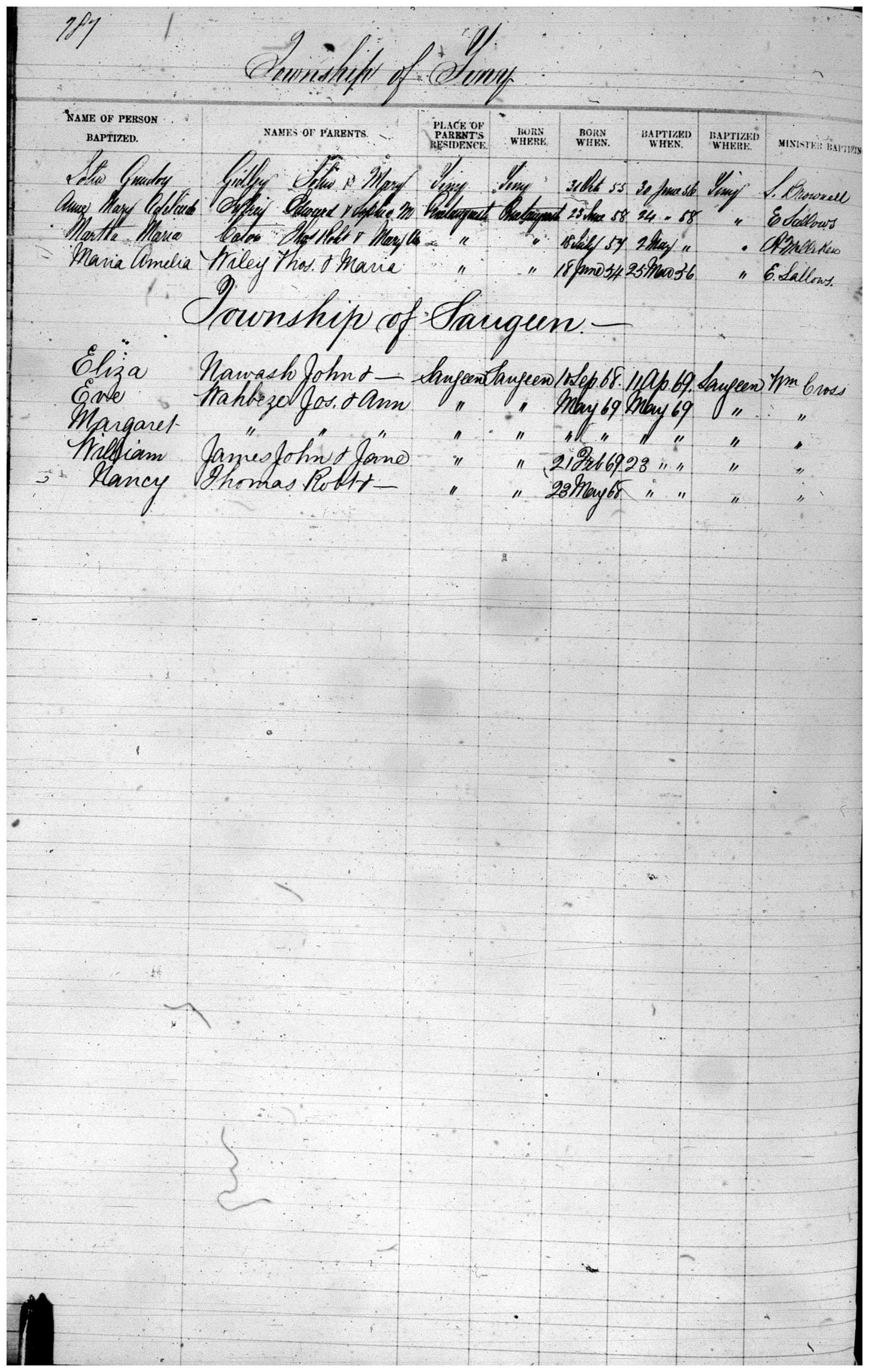 | Thompson | William James | 3/393.jpg | William | Nancy | Parry Island | McKellar | 1873-10-20 | 1874-06-17 | Parry Sound | Toye, Rev. R. | Parry Sound, ON | McDougall Twp. | 3 | 393 |