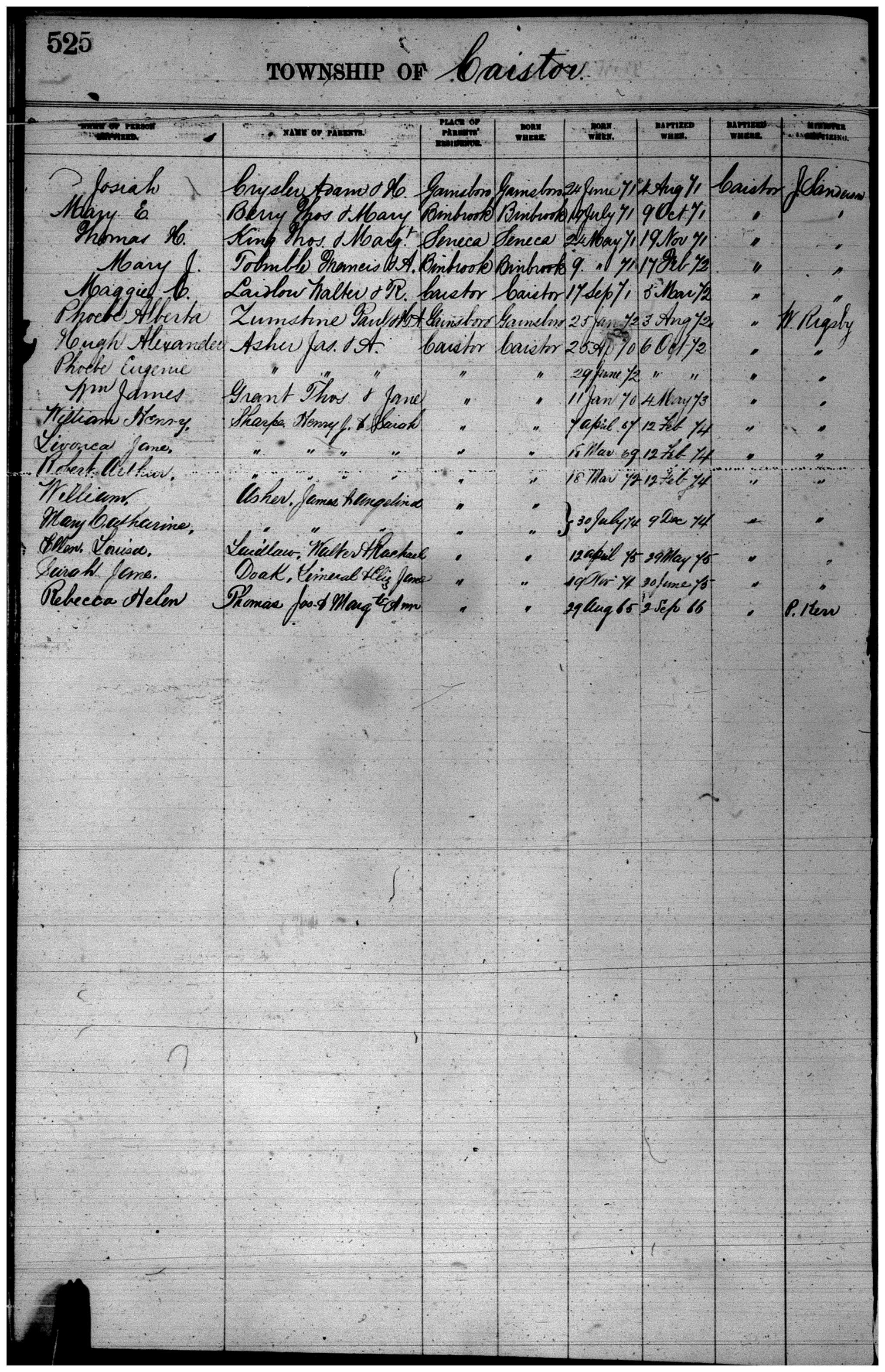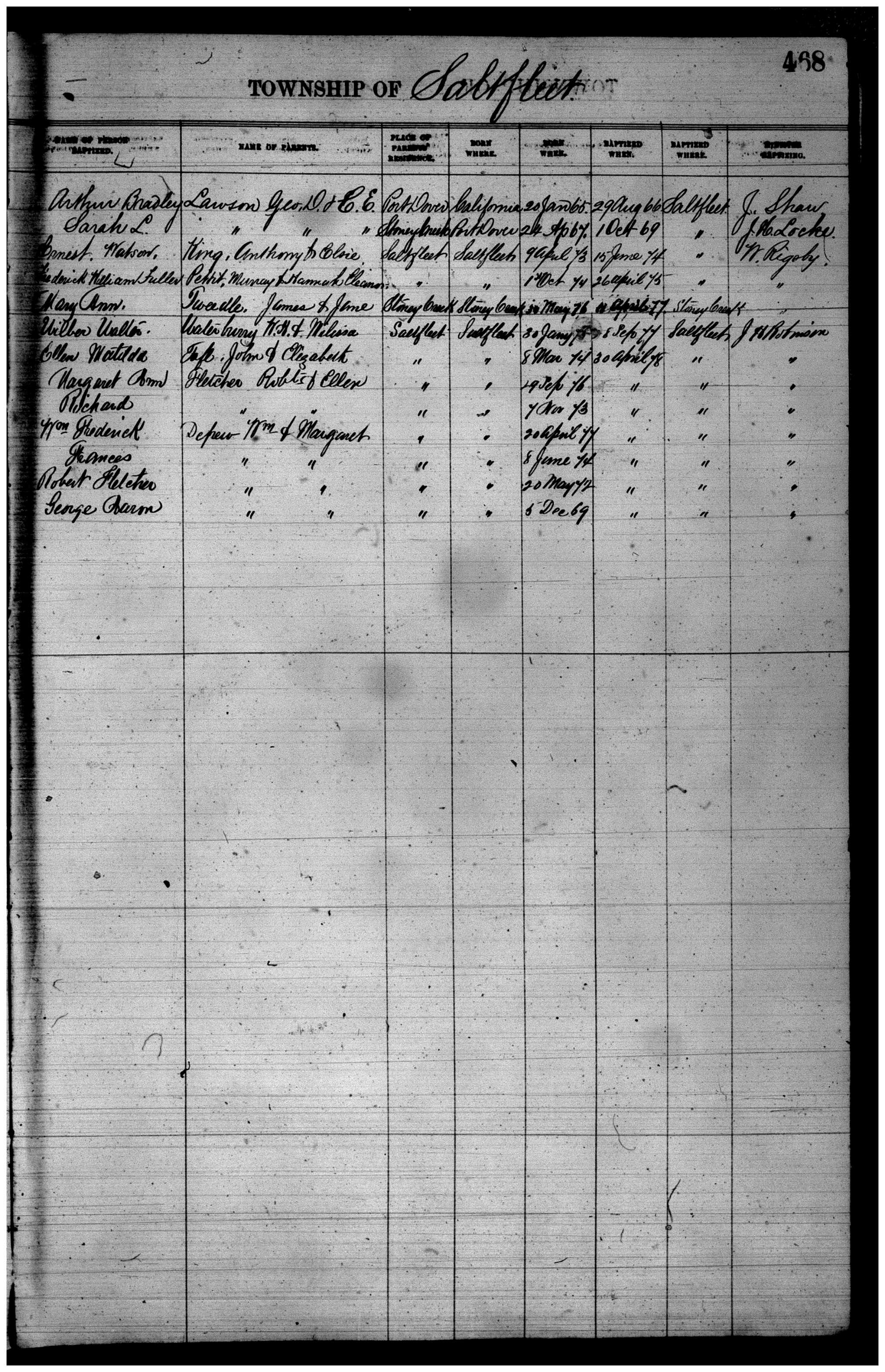 | Taft | Ellen Matilda | 3/468.jpg | John | Elizabeth | Saltfleet | Saltfleet | 1874-03-08 | 1878-04-30 | Saltfleet | Robinson, Rev. J. H. | Wentworth, ON | Saltfleet Twp. | 3 | 468 |
